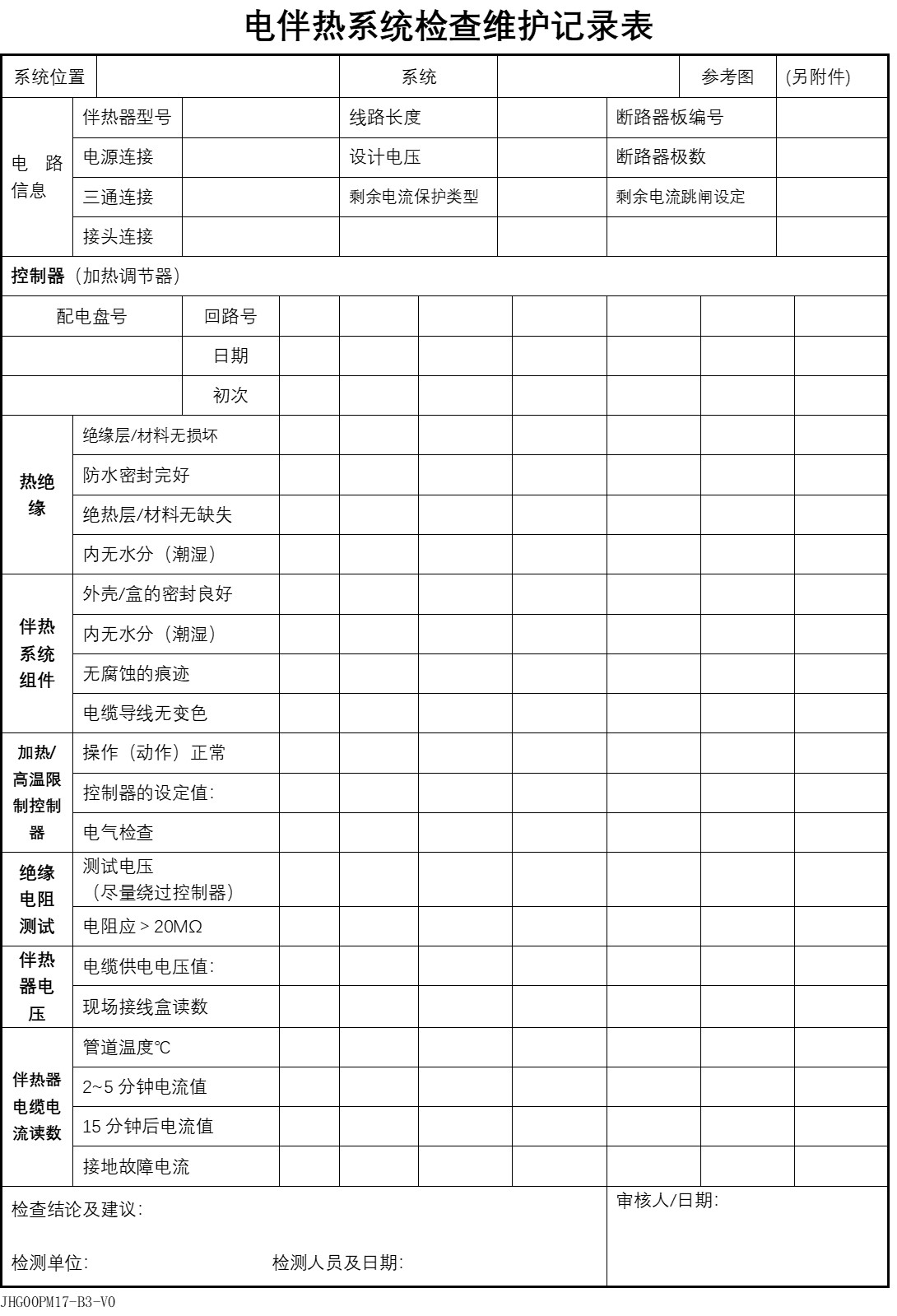 1.检查所有的电路及控制都应正常运行。应检查每个电路的额定电流和正确应用的电压。对接地故障设备保护设置应每年至少一次进行伴热器系统通电检查。用于关键过程控制的伴热系统,运行检查应更频繁。