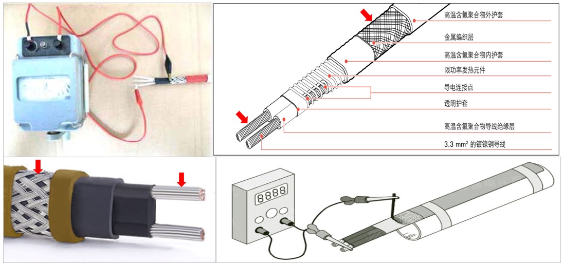 4)恒功率电伴热带的绝缘电阻的测量:恒功率电伴热带的测量方法和自限温电伴热带相同,都是采用DC,1KV兆欧表测量,只是最后的绝缘电阻不同,恒功率并联和串联的电阻不小于50MΩ。