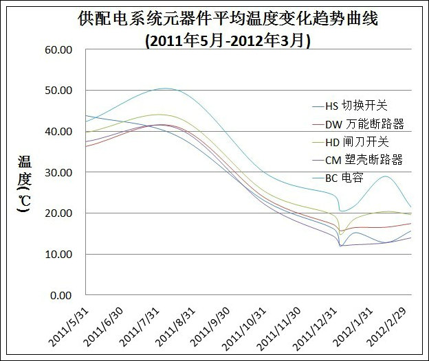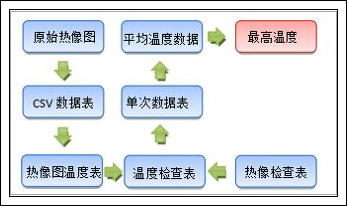 通过现场对各类需要检测的电气器件进行热像图数据采集,并将其转化为纯数据格式,这个数据表记录了单张热像图中每个像素上由热像元器件所检测到的温度。然后通过数据操作提取数值最高的5%的数据来反应元器件的最高温度。将此温度与热像图文件名相对应。而热像图文件名又对应于相应的器件名,从而得到器件在某一次热像检测中的温度数据。通过对这些温度数据的整理归纳就得到了器件的温度数据。