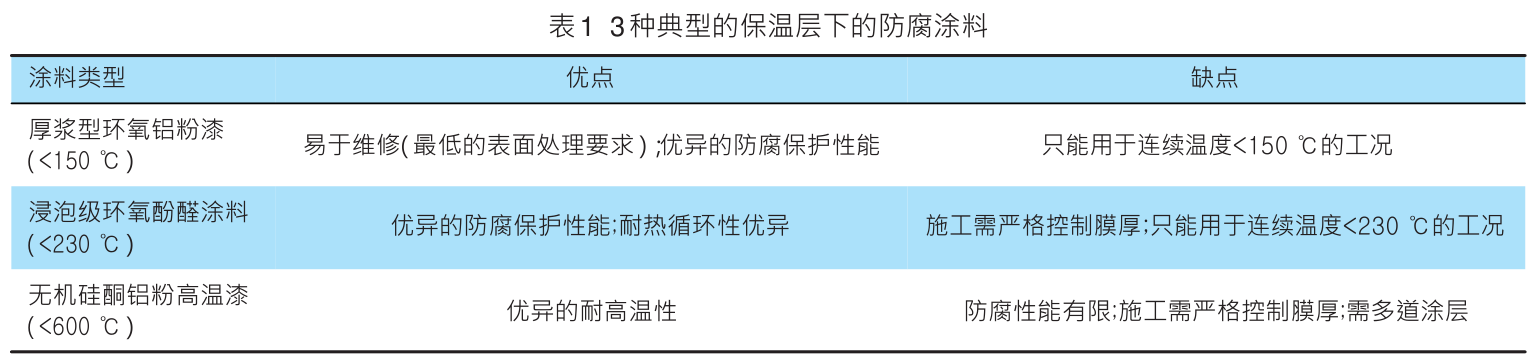 在高温防腐领域,美国腐蚀工程师协会(NACE)发布的RP0198-2004国际标准是比较详细和权威的。其中提出对于保温层下的防腐,最有效的方法是涂覆防腐蚀涂料。过去,保温层下应用较多的涂层包括厚浆型环氧铝粉漆、浸泡级环氧酚醛涂料、无机硅酮铝粉高温漆。简单类比如表1。