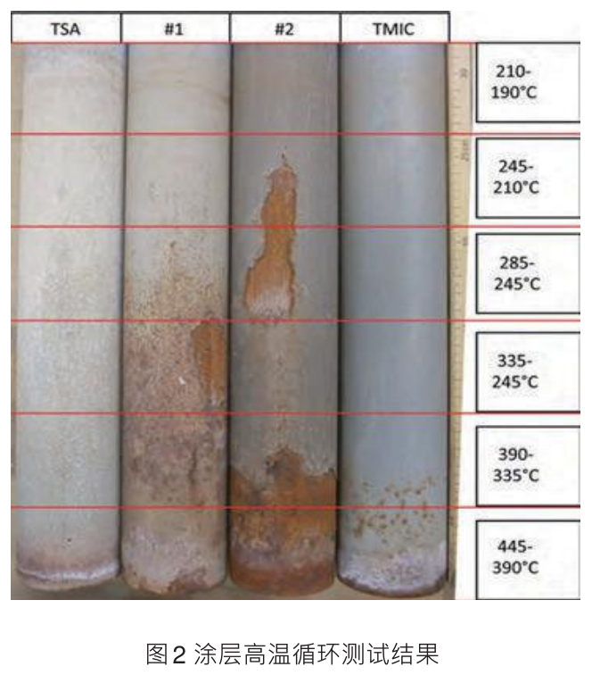 采用保温层下循环测试的实验方法,对用于保温层下的涂料和冷喷铝、热喷铝涂层(1#、2#:常规高温涂层;TMIC:冷喷铝;TSA:热喷铝)在高温环境下的防腐性能进行了测试。