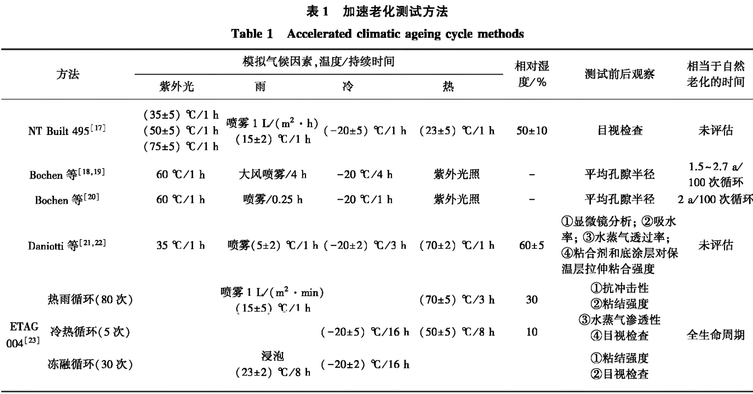 Griciute等基于ETAG004“External Thermal Insulation Composite Systems with Rendering”和ISO15686“房屋和建筑资产:服务年限计划”2项国际标准提出了一种适用于寒冷潮湿气候区的外保温复合体系耐久性预测方法。该技术在综合考虑建筑材料特性的基础上,确定了加速老化循环的潜在降解因子和指标,提出了一个可靠的加速老化周期,用于评价建筑外保温复合体系的耐久性。Rumiantcev等提出了一种适用于矿物棉保温结构耐久性评估的加速测试技术,其主要依据是矿物棉保温结构在模拟服役过程中发生形变后其压缩性和抗压强度的变化。杜柯等研制了一种纤维毡/气凝胶复合芯真空隔热板,并首次建立了真空绝热板热性能和使用寿命预测理论模型,利用该模型中的寿命曲线进一步探讨了气凝胶密度和纤维含量对使用寿命的影响。Bruno等通过对气凝胶保温材料进行加速老化试验,用氮气和水的吸附来跟踪微观结构演变,并用热流计测量热传导率,发现孔径分布和疏水化是在恶劣条件下影响气凝胶耐久性的关键参数。