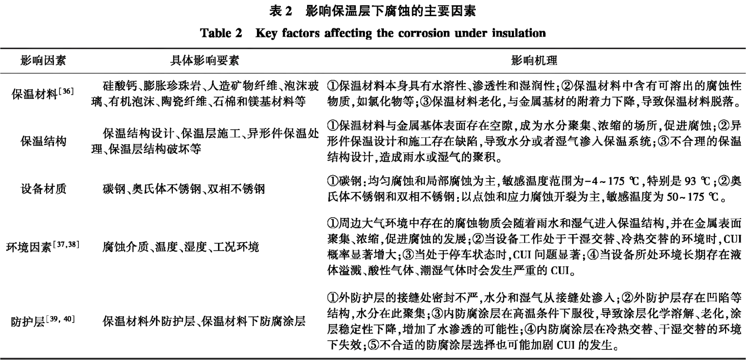 从CUI的基本原理可以看出,影响CUI的因素有很多,包括:保温材料、保温结构、设备材质、大气成分和管道/设备防护层等,其具体的影响归纳在表2中。